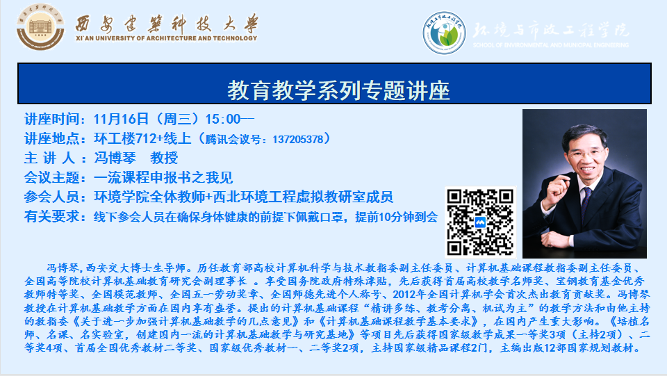 为了进一步深化我院教师对一流课程申报书的认识,并解答教师在申报过程中存在的疑惑,2022年11月16日我院特邀西安交通大学冯博琴教授为全体教师以及西北环境工程虚拟教研室成员讲授关于“一流课程申报”内容的讲座。讲座采用线上+线下(环工楼712)混合形式进行,由刘立忠副院长主持,院长卢金锁教授致辞。图1 冯博琴教授做汇报交流冯博琴教授首先总结了自己在打磨和阅改一流课程时,作为申报人时的疑惑和作为评审专家时发现的...