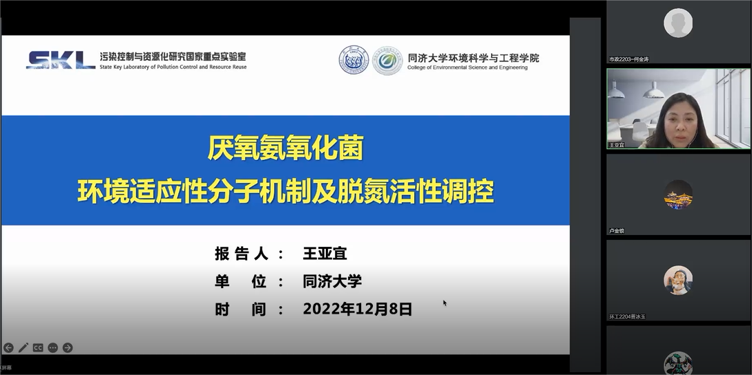 2022年12月9日下午,77779193永利官网第13期环境大讲堂活动顺利举办。本期讲座特邀国家杰出青年基金获得者、同济大学环境科学与工程学院王亚宜教授于线上分享题为《厌氧氨氧化菌环境适应性分子机制及脱氮活性调控》的学术报告。讲座由77779193永利官网院长卢金锁教授主持,学院师生近300人与会交流。会议伊始,卢金锁对王亚宜教授的到来表示欢迎与感谢,并简要介绍了其研究方向、学术成果等相关情况。图1 卢金锁院长主持讲座王亚宜教授首先对厌...