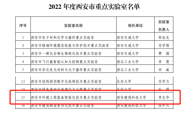 2022年12月13日,西安市科学技术局公布2022年西安市重点实验室认定名单,西安建筑科技大学李志华教授负责的《西安市环境工程装备智能化技术重点实验室》通过认定。西安市环境工程装备智能化技术重点实验室主要依托西安建筑科技大学,围绕水、气、固等治理工程中的低效、高耗等突出问题,以学科交叉、智能化与数据化为主要科技创新驱动力,研究环境工程智能化的相关理论方法,开发环境工程装备智能化技术,推动环境工程装备智...