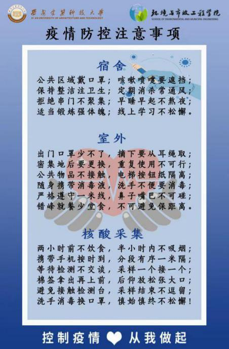 坚决防止疫情向校园蔓延,确保师生生命安全和身体健康是高校的一项重大政治任务。学院始终紧绷疫情防控这根弦,坚持“守校有责、守校尽责、严格管理、用心服务”,建立健全疫情防控宿舍管理体系,实行“辅导员(楼长)-层长-舍长”宿舍网格化管理体系,层层落实,建立健全“人盯人”防控体系,做到全覆盖、无遗漏、无死角。建立不在校学生管理台账,加强不在校学生的管理,严防死守,精细管理,科学防控,确保全面准确、不漏一人;建立信息日报制度,坚持每日报送在校学生信息、核酸检测完成情况、每日联系报告制度,对学生严管理、厚关怀,确保学生在校安心学习、健康生活。用力用功确保各项工作平稳有序开展,用心用情守护师生平安健康!