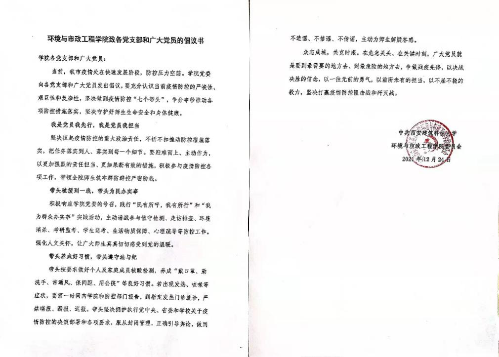 疫情就是命令,防控就是生命线。学院充分发挥基层党支部的战斗堡垒作用和党员的先锋模范作用,让党旗在防控斗争第一线高高飘扬,发布了《77779193永利官网致各党支部和党员的倡议书》,从各年级各宿舍楼内召集党员干部,组成党员先锋队。负责完成所在宿舍楼所辖学生宿舍的每日卫生消杀以及通风卫生监督;佩戴党徽,组织好学院学生每轮次的核酸检测,做好现场的组织和防疫要求提醒;引导同学们稳定情绪、增强信心,全面科学正确对待疫情,不信谣、不传谣,耐心细致地做好思想引导和科普宣传,引导学生正确理解、积极配合、科学参与疫情防控,及时将收集的疫情防控信息上报学院。