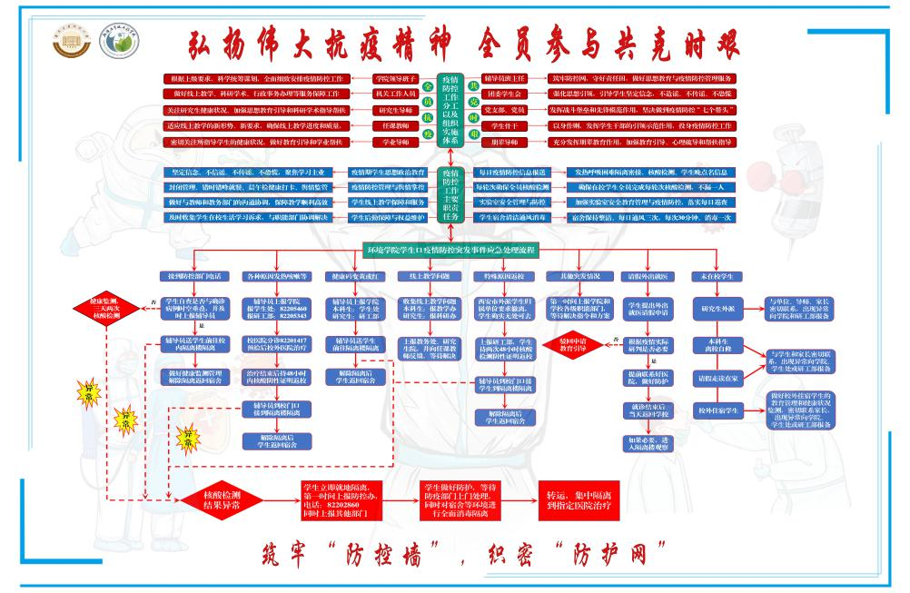 根据疫情防控形势发展变化,统筹各方资源,系统谋划,构建77779193永利官网疫情防控工作体系和突发事件应急处理流程,建立健全防疫工作体系,切实提高疫情防控科学性和有效性。弘扬伟大抗疫精神,全员参与共克时艰。广泛动员师生、组织师生、凝聚师生,共同筑牢群防群治的“防控墙”、织密抵御疫情的“防护网”。构建全员参与、全过程管控、全方位指导服务的工作组织实施体系,明确疫情防控工作任务,切实确保师生健康平安和各项教育教学活动的顺利开展。