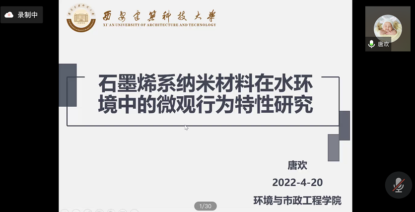 唐欢老师以《石墨烯系纳米材料在水环境中的微观行为特性研究》为题,首先指出石墨烯系纳米材料在水中的行为特性是水环境领域的研究热点;接着介绍了纳米材料的定义、特点及分类,引出分子动力学模拟及量子化学计算的研究手段,该手段可提供分子原子层面的信息,以完善对石墨烯系纳米材料在水中行为特性的科学理解。