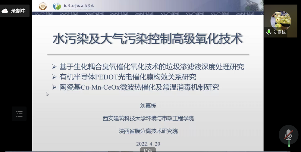 刘嘉栋老师以《水污染及大气污染控制高级氧化技术》为题,首先展示了“臭氧催化氧化+生化法”集成技术反应器的流程与发展情况,并从微生物作用机制角度对反应过程进行分析;接着围绕有机半导体PEDOT开发了光电催化微滤膜材料,明确了其在水处理过程中的光电响应机理;最后以陶瓷基Cu-Mn-CeOX为基础,对微波热催化条件下的VOCs去除机制及常温消毒效果展开讨论。
