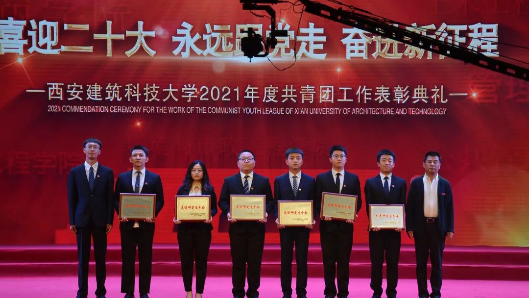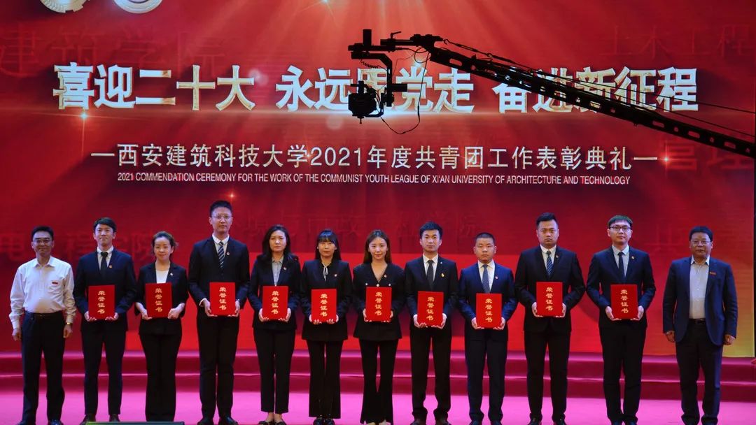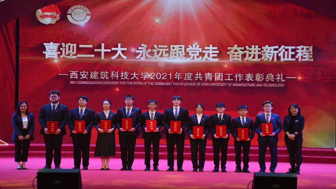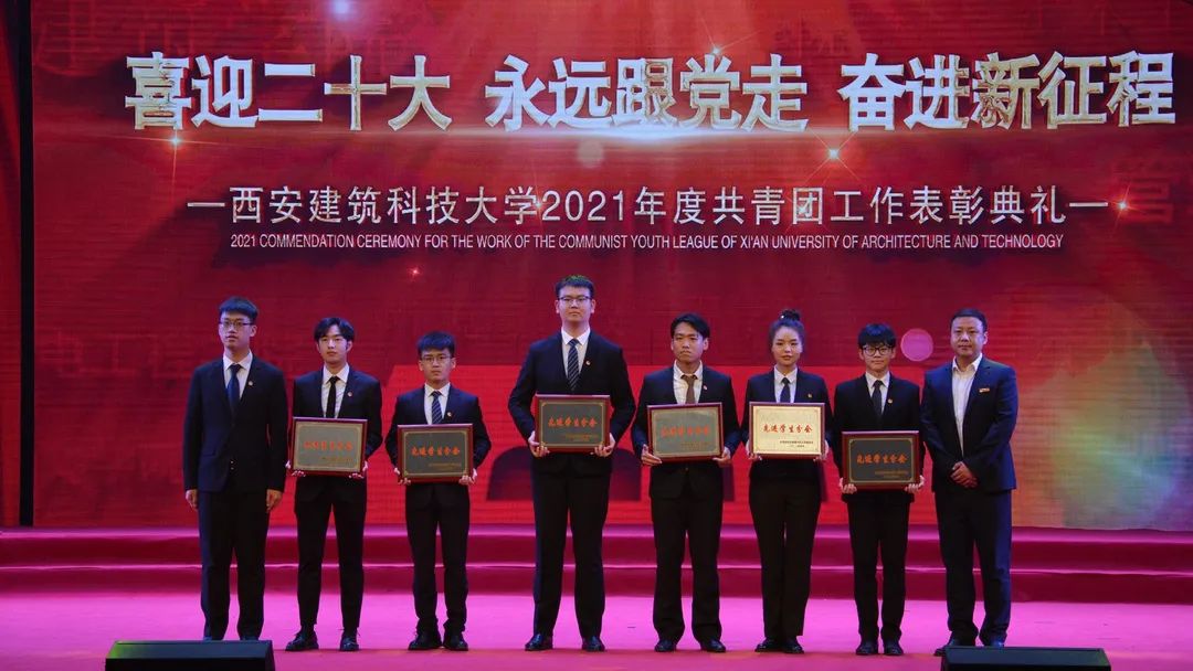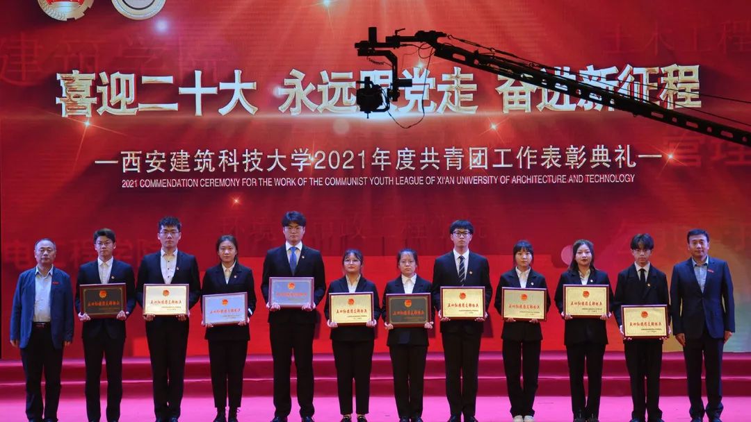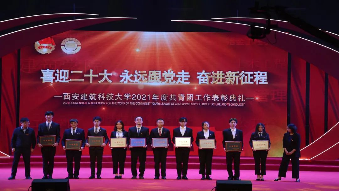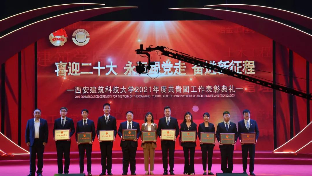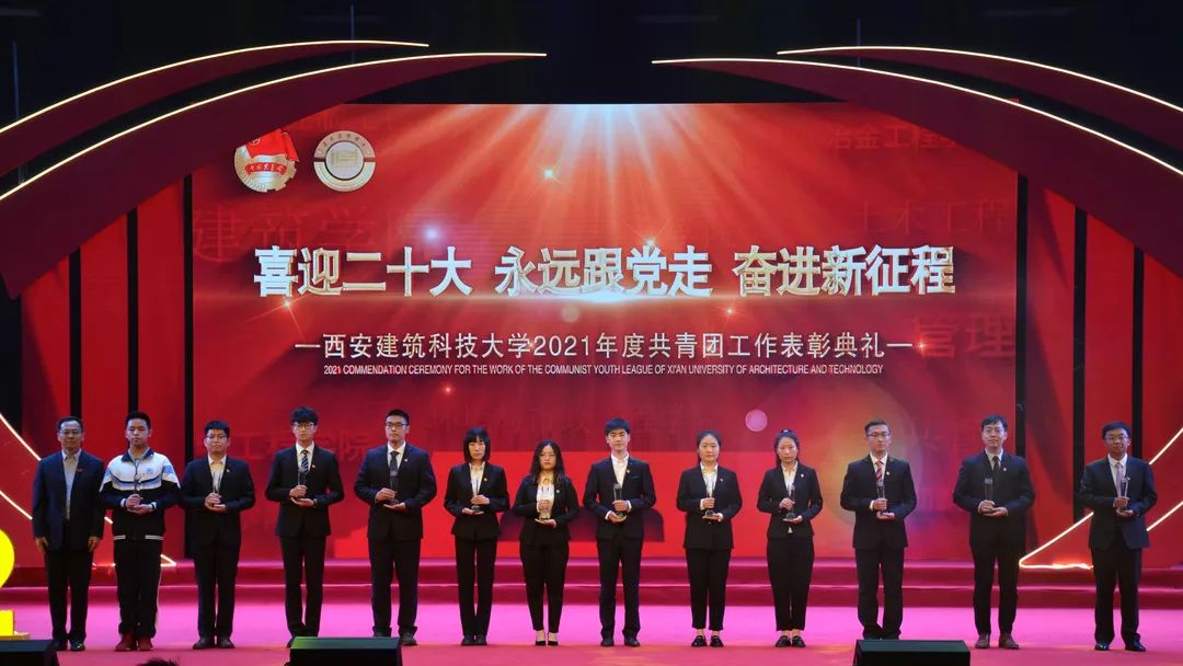 2022年4月28日晚,“喜迎二十大,永远跟党走,奋进新征程”——西安建筑科技大学2021年度共青团工作表彰典礼在草堂校区紫阁大礼堂举行。