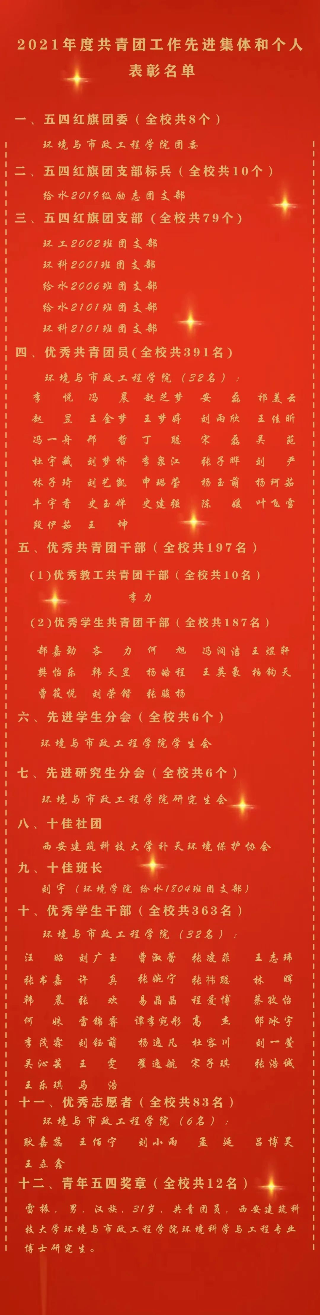 希望以上受表彰的集体和个人珍惜荣誉,戒骄戒躁,更好地发挥模范带头作用,在学习和工作中取得更大的成绩,也希望我院团学组织、团学干部和广大青年学生以他们为榜样,围绕学校“11445”发展新格局,勤奋学习,锐意进取,不断创新,扎实工作,为新时代学校追赶超越的高质量发展贡献环境青年的智慧和力量,以更加优异的成绩迎接党的二十大召开,献礼建团100周年。