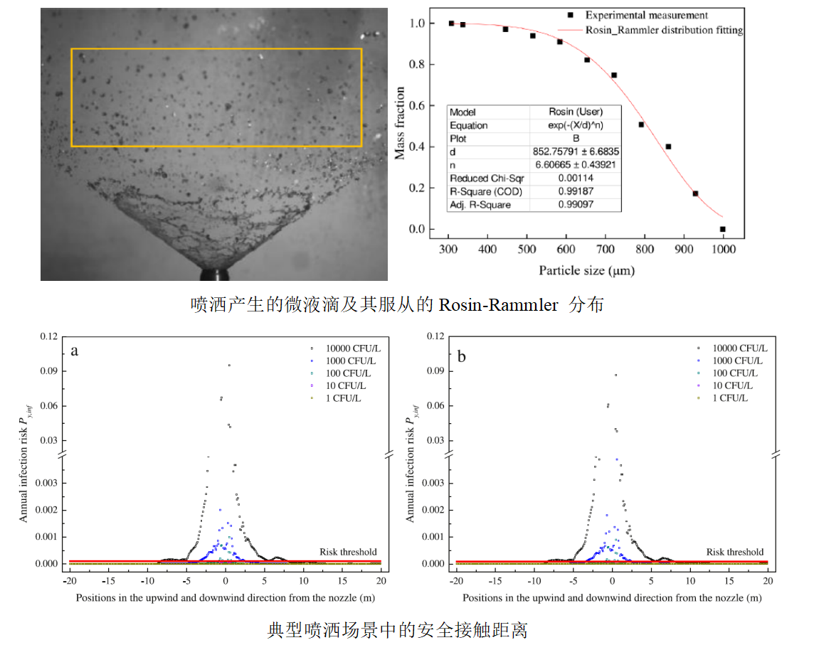 污水再生利用是缓解缺水城市和地区水资源供需矛盾的重要途径。然而,再生水中可能含有的病原微生物对人体健康构成潜在的威胁。再生水常用于绿地浇灌、景观喷泉、道路降尘等,经过喷洒设施雾化后会产生大量微小液滴弥散于空气中,从而形成水气溶胶并随气流漂移扩散。如果置身于再生水喷洒场景中,很可能吸入包含病原微生物的水气溶胶,进而导致感染和疾病。掌握喷洒产生的水气溶胶空间分布特征和影响因素,对于准确评价水气溶胶吸入暴露风险至关重要。