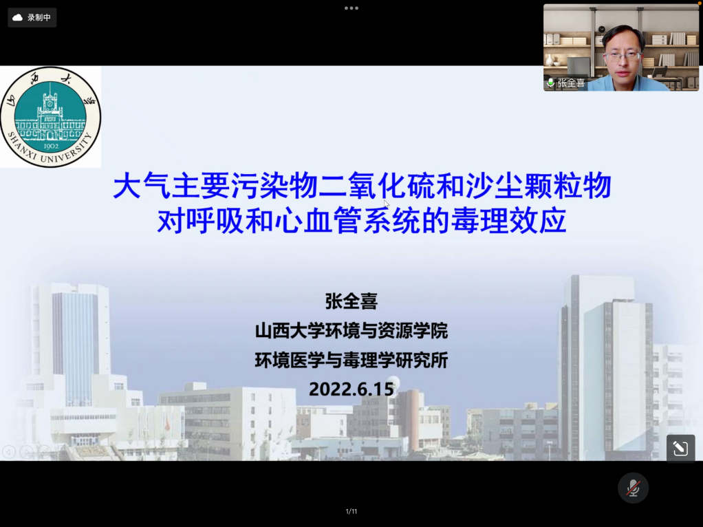 张全喜教授以《大气主要污染物二氧化硫和沙尘颗粒物对呼吸和心血管系统的毒理效应》为题,首先向大家简要介绍了山西大学环境科学与工程学科概况;随后分析了SO2、沙尘颗粒对呼吸和心血管系统的影响及毒理学研究机制;最后讲述了环境健康学科的形成简史及对未来研究的展望。