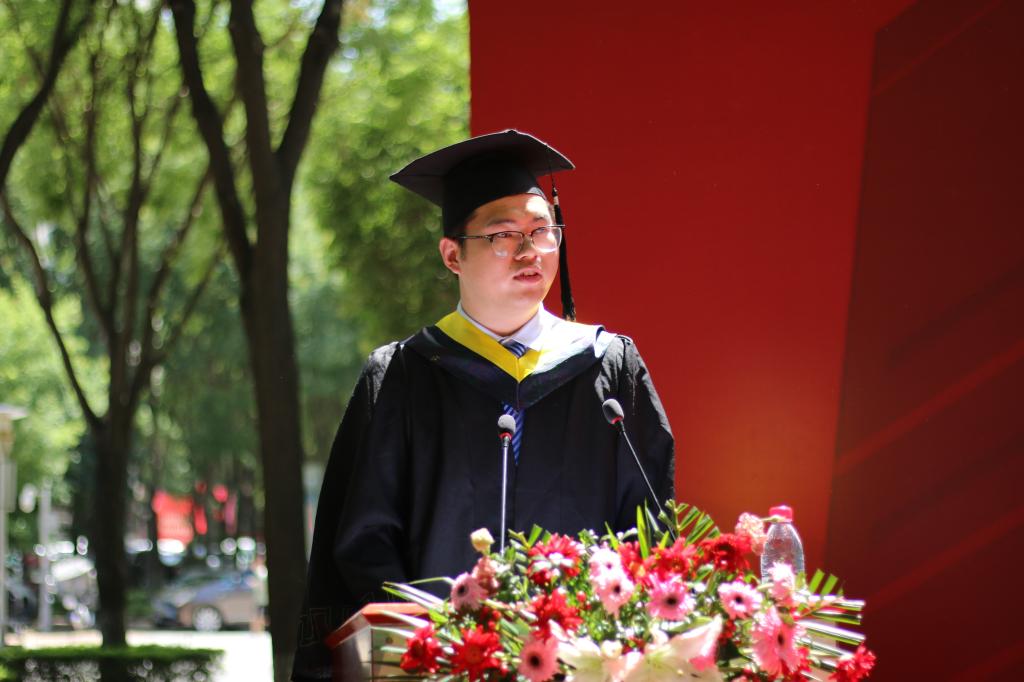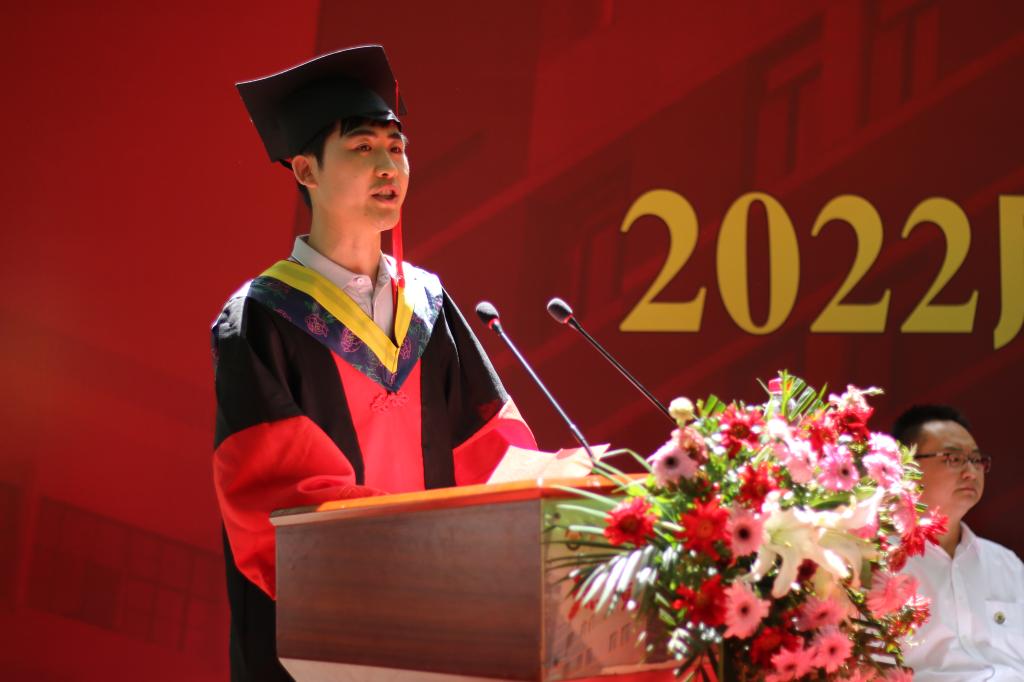 毕业研究生代表,环境科学与工程2018级博士生雷振同学,本科毕业生代表给水1804吕家强同学依次发言,他们回忆了自己忙碌又充实的大学生活,回顾了几年的求学之路,向母校表达了最衷心的感谢,向辛勤的各位老师表达了最诚挚的敬意,同时鼓励大家在未来的道路上继续进取,传播建大精神,续写建大篇章。