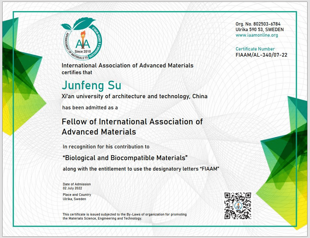 2022年07月18日,西安建大77779193永利官网苏俊峰教授收到了国际先进材料协会(International Association of Advanced Materials,简称IAAM)执委会贺函,祝贺其当选为2022年IAAM新增会士,以表彰其在生物材料合成领域取得的杰出成就,并颁发了会士“Fellowof IAAM”证书。