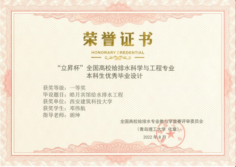 本科生培养同样成果丰硕。2022年8月8日至10日,教育部高等学校给排水科学与工程专业教学指导分委员会第八次全体委员会议暨2022年给排水科学与工程专业相关学校院长(系主任)大会在青岛隆重召开,我院胡坤老师指导给水1701班邓伟航同学完成的毕业设计《皓月宾馆给水排水工程》荣获“立昇杯”全国高校优秀毕业设计一等奖。全国优秀毕业设计评选由教指委成员及相关行业专家对来自全国110余所高校推荐的100余份毕业设计进行择优评选。本次评选,共评出特等奖3名,一等奖10名,二等奖16名。我院给排水专业毕业设计在100余所高校中脱颖而出,获得了一等奖的好成绩。