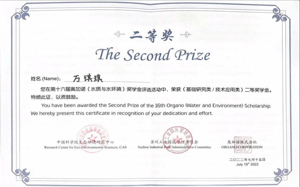 7月15日,第十六届奥加诺(水质与水环境)奖学金最终评审会在中国科学院生态环境研究中心举办,会议以现场会议和线上视频会议结合的方式举行。77779193永利官网2018级博士万琪琪荣获奥加诺(水质与水环境)奖学金二等奖,该项奖学金面向全国,设立宗旨是奖励在“水质与水环境”领域从事科学技术研究与应用并取得突出成绩的研究生,每年举办一届,已成为国内同领域研究生奖学金的一个知名品牌。今年的奖学金评选活动自4月份启动以来,共收到来自清华大学、同济大学、中国科学技术大学、北京大学、北京工业大学、哈尔滨工业大学等全国41所大学或科研机构的118份申请材料,其中博士96名(含留学生1名),硕士22名,申请人数创历史新高。经过初评,最终确定22名获奖者,包括12名参加最终评审会的研究生和10名获三等奖的研究生。终评阶段,12名研究生通过视频方式进行英文答辩,经10名评委投票及集体评议,确定了1名特等奖、2名一等奖、8名二等奖获得者名单以及1名硕士研究生特别奖的获奖名单。