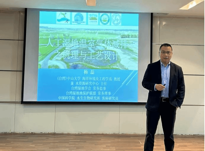 随后,杨磊教授以“人工湿地温室气体减排之机理与工艺设计”为题,为全场师生带来了一场内容丰富的学术讲座。他深入剖析了污水处理厂与人工湿地在污水处理过程中的碳足迹问题,以及人工湿地温室气体减排的机理与工艺设计。他指出,污水处理厂和人工湿地作为污水处理的关键环节,在净化水质的同时,也伴随着大量温室气体的排放,如二氧化碳、甲烷和氧化亚氮等,这些排放对系统的碳吸存效益构成了一定挑战。