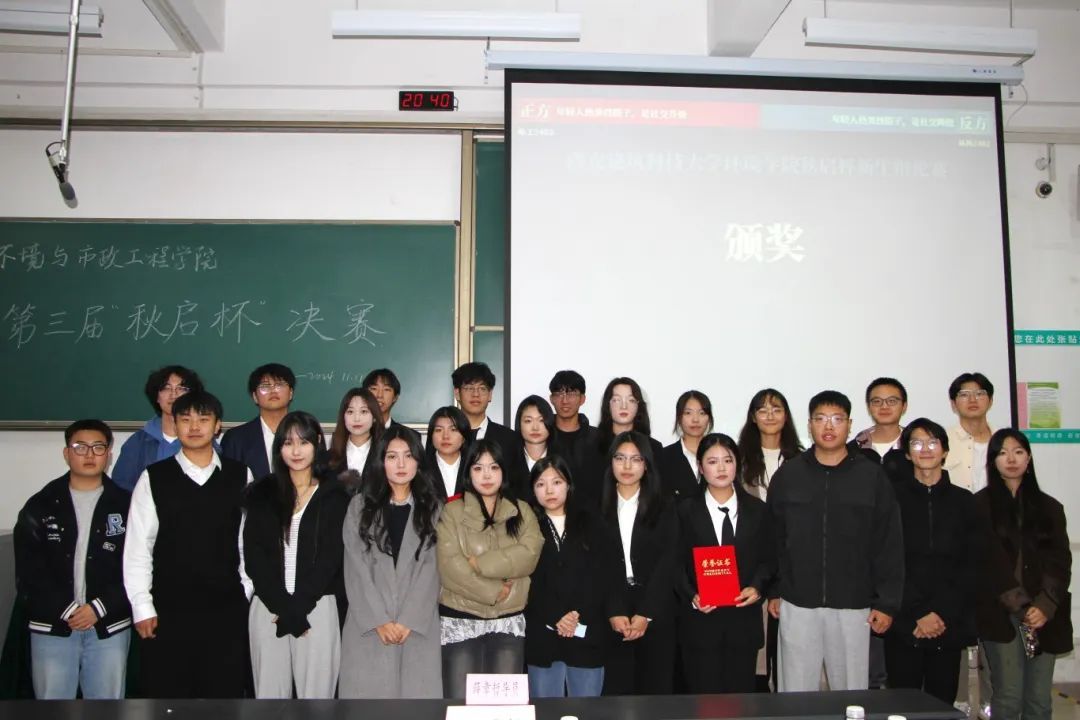 本场比赛正方:反方9:6,正方获胜。环工2403代表队获得本届“秋启杯”新生辩论赛决赛冠军,环科2402代表队获得亚军,问乐天、黄晓宇同学获得“最佳辩手”称号。薛章哲老师为他们颁奖并合影留念。