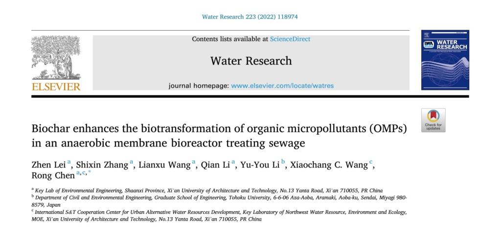 近日,我校陈荣教授团队在厌氧膜生物反应器处理城市污水中有机微量污染物方面取得新进展,成果以“Biochar enhances the biotransformation of organic micropollutants (OMPs) in an anaerobic membrane bioreactor treating sewage”为题发表于“Water Research”。团队博士生雷振为论文第一作者,陈荣教授为论文通讯作者,西安建筑科技大学为论文第一完成单位。