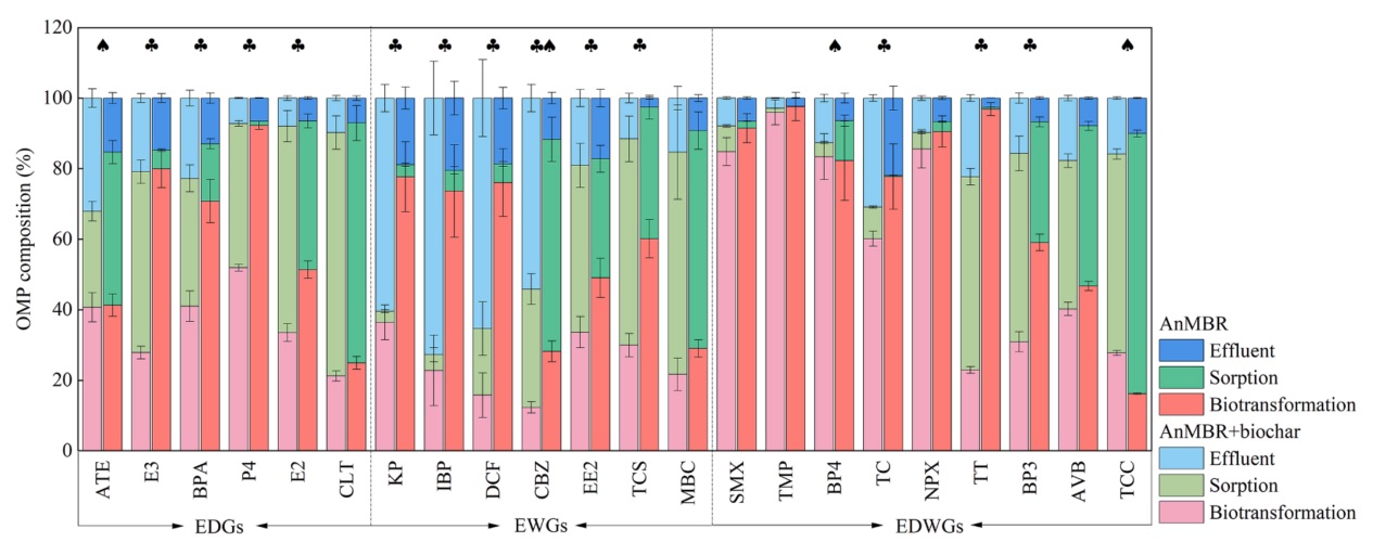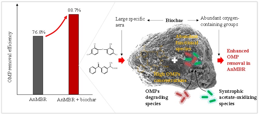 膜生物反应器可通过维持较长的污泥停留时间强化污水处理中有机微量污染物(OMP)的去除。厌氧膜生物反应器(AnMBR)作为一种低能耗且可产生再生能源的技术,较好氧MBR更具发展前景。然而,由于厌氧条件限制,AnMBR对一些生化降解性较差的OMP难以高效去除。虽然添加活性碳类材料可以强化OMP去除,但已有报道中更多关注活性碳的吸附作用,需经常添加或更换活性炭,经济成本高。低温热解制备的生物炭作为一种经济环保的新型碳材料,在强化OMP去除方面的研究很少,作用机理尚不明确。