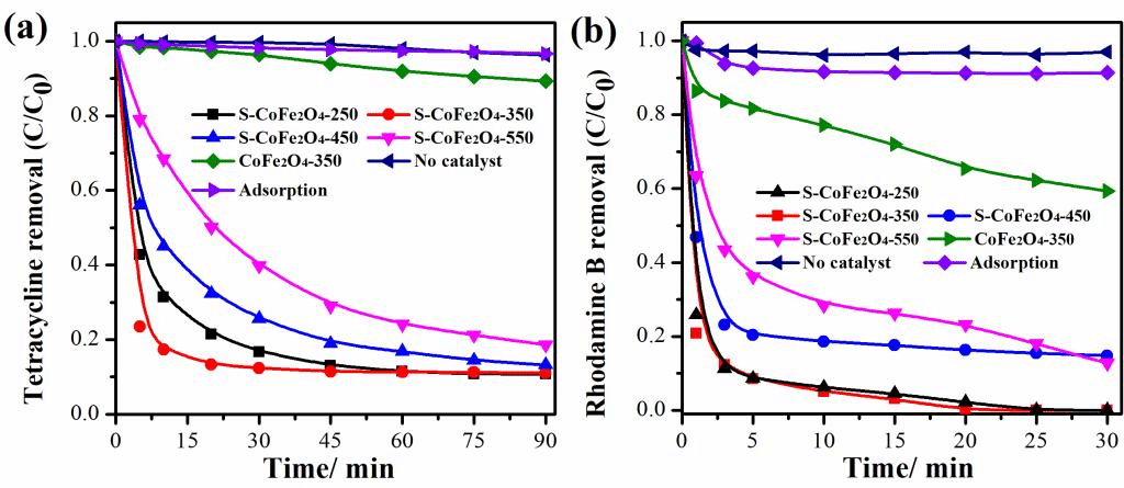 本研究首次以S-CoFe2O4作为新型芬顿催化材料,克服了传统芬顿氧化工艺中可溶性Fe2+的限制,如:pH适用范围的局限,可重复性差以及铁泥的生成等造成的二次污染等。电化学测试表明硫掺杂有效降低了CoFe2O4的电子传递内阻,结合密度泛函计算,证实了S-CoFe2O4中Fe-S键和Co-S键具有较高的电荷密度,介导不同价态的铁、钴离子得以持续循环利用。最终实现了以较低催化剂的投加量和较少反应时间,在保持活化剂重复可利用性的同时达到了对污染物的高效去除,突破了常规类芬顿氧化工艺的瓶颈。
