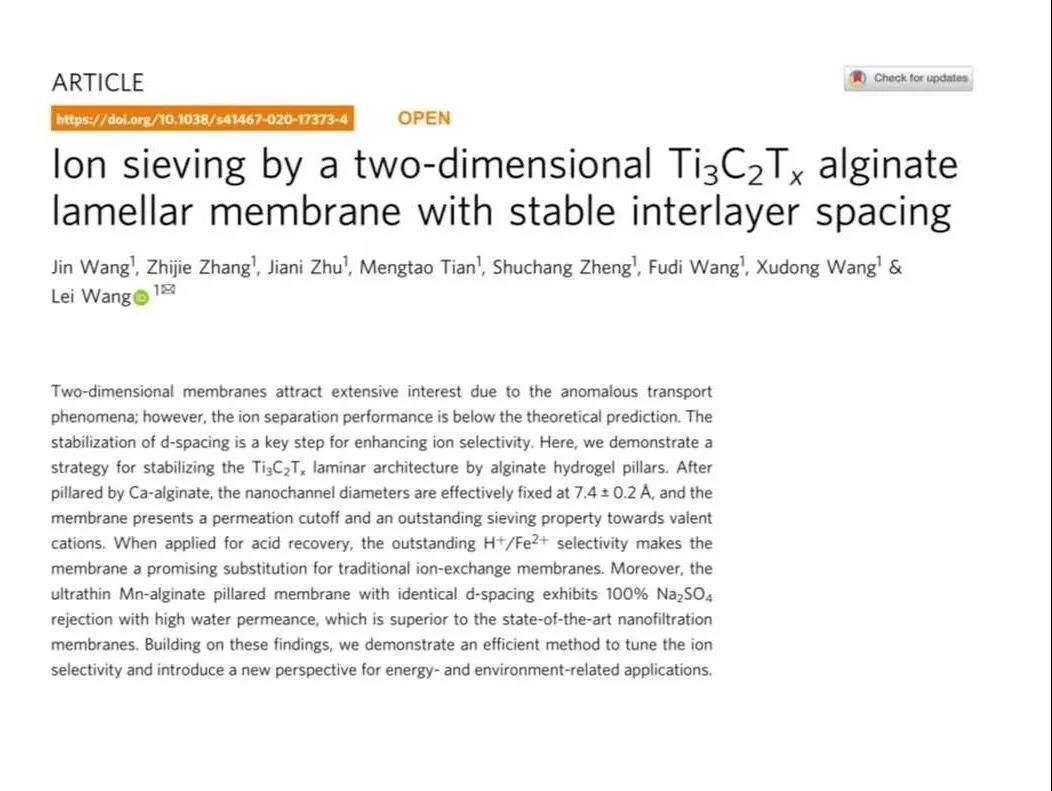 近期,我校77779193永利官网、陕西省膜分离技术研究院王磊教授团队在二维纳米材料构筑具有高效离子筛分性能薄膜方面取得重要进展。研究成果“Ionsieving by a two dimensional Ti3C2Tx alginate lamellar membrane withstable interlayer spacing”(具有稳定通道的二维Ti3C2Tx-海藻酸层状膜的离子筛分特性研究)于2020年7月15日在线发表于国际顶级学术期刊《Nature Communications》(IF=12.12)上。